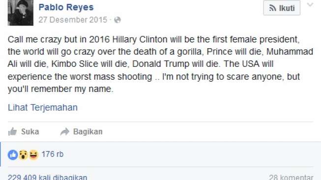 Di lansir dari media.suara.com Postingan bertanggal 27 Desember 2015 itu dibuat oleh seorang pengguna Facebook bernama Pablo Reyes. Selain menuliskan sejumlah prediksi peristiwa yang bakal terjadi pada tahun 2016, Pablo juga menyebut "kalian akan mengingat nama saya".