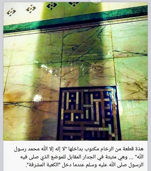 Gambar 4: Bagian kecil di dinging Ka’bah berupa batu tertentu. Posisinya menghadap tempat shalat Nabi ﷺ tadi. Pada batu tersebut tertulis kalimat “laa ilaaha illallaah, Muhammad rasulullah”.