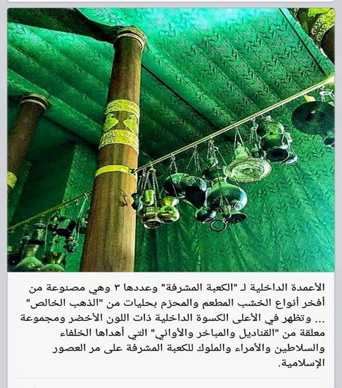 Gambar 6: Tiga buah tiang di dalam Ka’bah. Tiang ini terbuat dari kayu yang terbaik dan disepuh dengan emas murni. Bagian atasnya terlihat kain kiswah bagian dalam yang berwarna hijau. Tampak juga pada gambar ini lampu-lampu kecil, tempat pengasapan kayu gaharu, dan wadah-wadah. Benda-benda tersebut adalah hadiah pemberian dari para khalifah, para sultan, para amir, dan para raja sepanjang sejarah Islam untuk Ka’bah yang mulia.