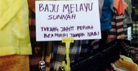 Tulisannya berbunyi, 'Baju Melayu Sunnah' Tukang Jahit Pernah Bermimpi Jumpa Nabi. Sontak tulisan itu menjadi viral di dunia maya.