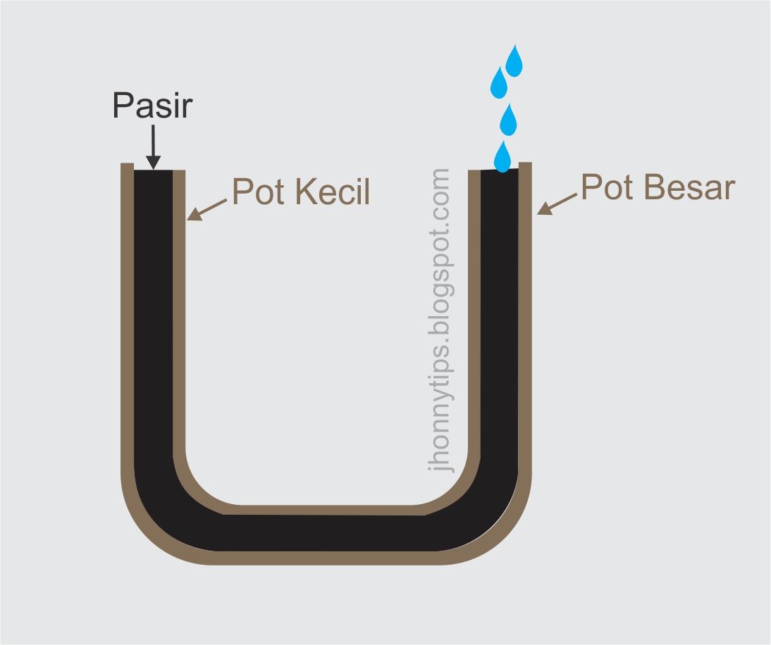 Simple saja membuatnya, hanya memerlukan 2 pot tanah liat (satu kecil dan satunya agak besar yang ketika dimasukkan pot kecil masih menyisahkan ruang 3-5cm), pasir, kain, dan air, simple banget kan..