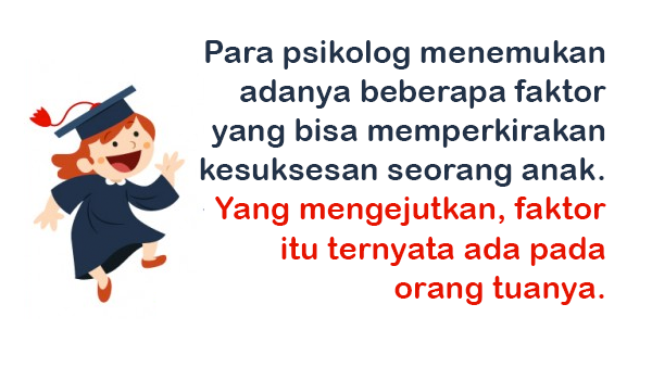Penulis Penulis | Ditayangkan 12 Jul 2016Sesungguhnya tidak ada resep parenting khusus dalam membesarkan seorang anak agar menjadi orang yang sukses hingga mampu menjadi seorang yang sukses. Namun para psikolog menemukan adanya beberapa faktor yang bisa memperkirakan kesuksesan seorang anak. Yang mengejutkan, faktor itu ternyata ada pada orang tuanya.