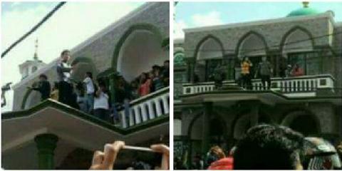 Stefan William Umboh naik ke atap Masjid untuk menyapa kerumunan warga yang memenuhi jalanan di area tersebut. |