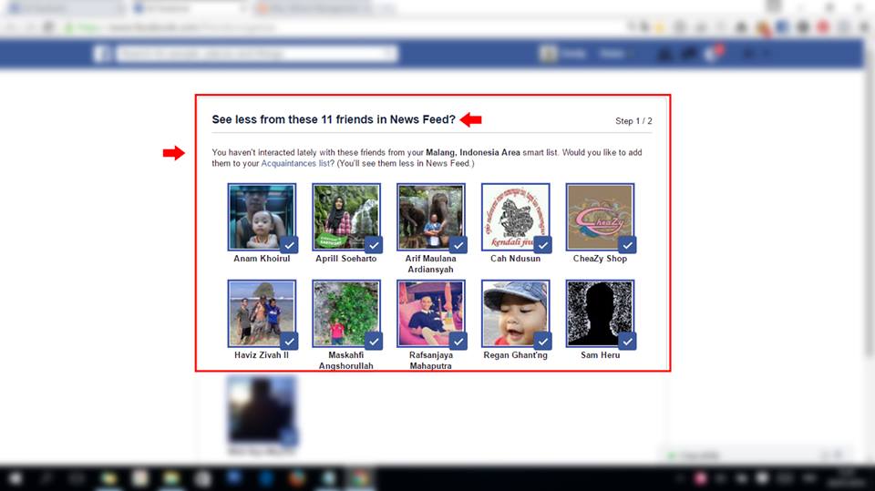 setelah itu, nanti akan di redirect ke halaman "management pertemanan", di halaman tersebut Anda akan mendapati daftar nama-nama akun yang jarang berinteraksi dengan akun Anda berdasarkan "Geo Location", klo akun saya sih, "stay" di malang, mungkin dalam kasus Anda, bisa dari Surabaya, Jakarta atau kota-kota yang lain, sesuai dengan settingan.