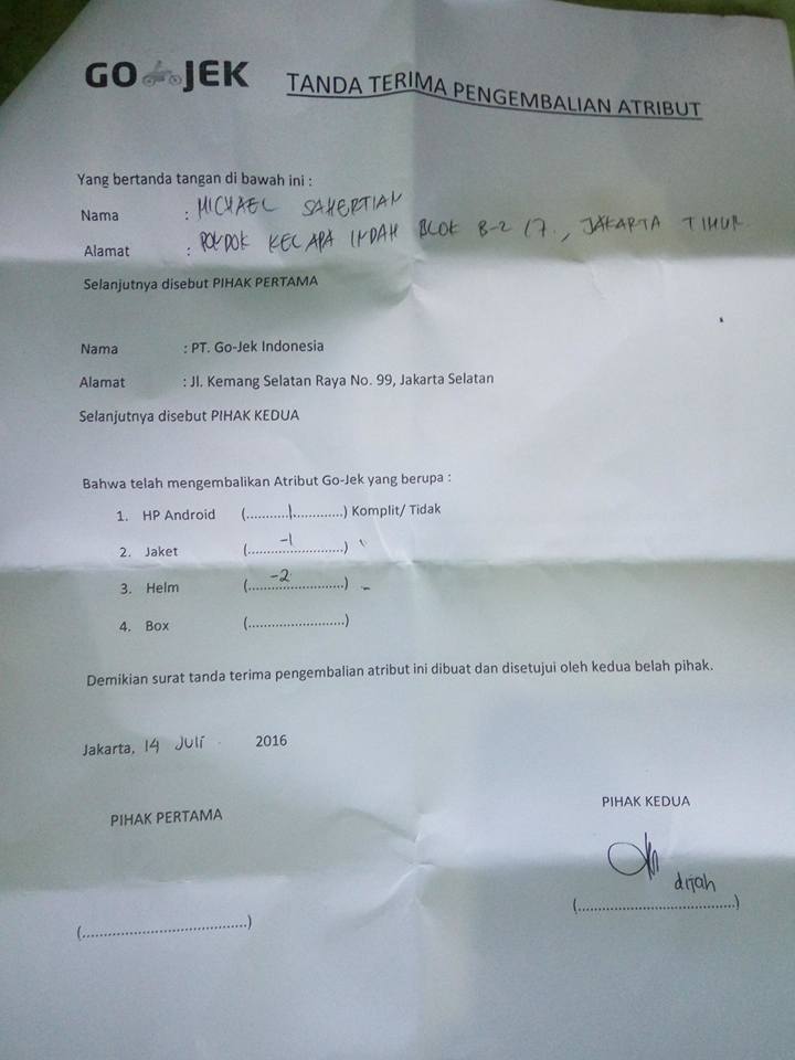 1. PT. GOJEK INDONESIA sudah menyiapkan format pengunduran diri (terlampir) dan disitu ditulis bahwa saya BEKERJA DI PT. GOJEK INDONESIA sebagai driver.