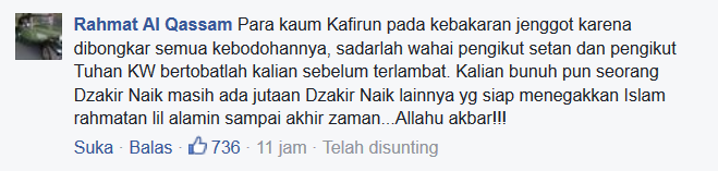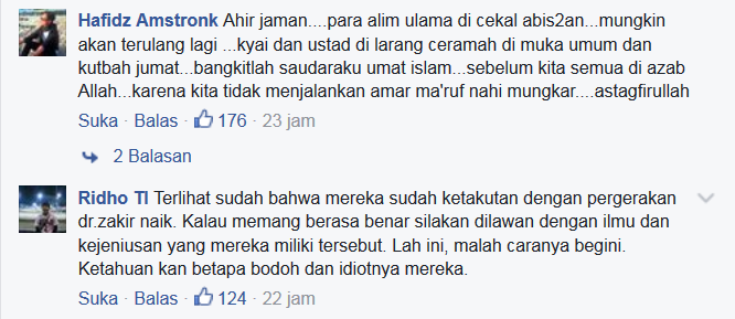 "Terlihat sudah bahwa mereka sudah ketakutan dengan pergerakan dr.zakir naik. Kalau memang berasa benar silakan dilawan dengan ilmu dan kejeniusan yang mereka miliki tersebut. Lah ini, malah caranya begini. Ketahuan kan betapa bodoh dan idiotnya mereka." ungkap akun Ridho TI