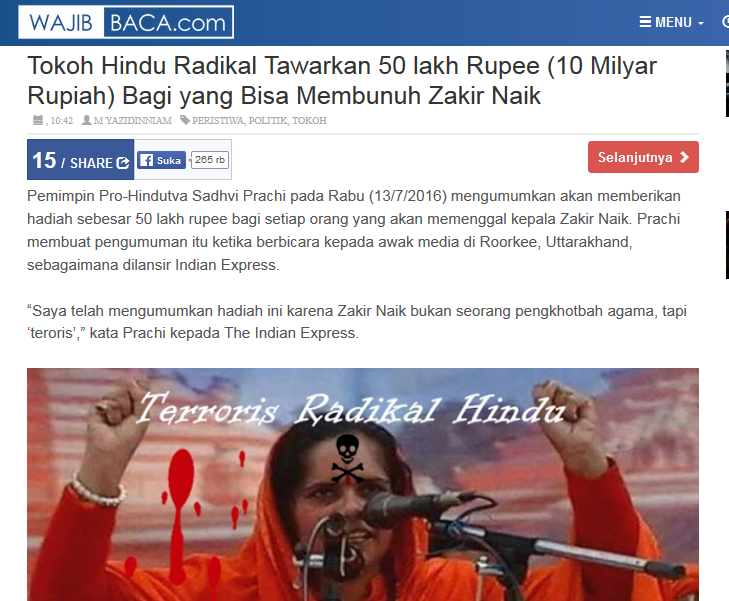 Siapa yang dapat membunuh Dr. Zakir Naik, akan diberi imbalan 50 lakh rupe, oleh pemimpin Pro-Hindutva Sadhvi Prachi. Ia mengumumkan sayembara ini pada Rabu (13/7/2016), bahwa akan mendapat hadiah sebesar 50 lakh rupee bagi setiap orang yang akan memenggal kepala Zakir Naik. Prachi membuat pengumuman itu ketika berbicara kepada awak media di Roorkee, Uttarakhand, sebagaimana dilansir Indian Express.
