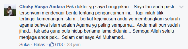 Urai akun Choky Rasya Andara : "Pak dokter yg saya banggakan... Saya tau anda pasti tersenyum mendengar berita tentang pengancaman ini... Tapi inilah titik tertinggi kemenangan Islam... berkat kejeniusan anda yg membungkam seluruh agama bahwa Islam adalah Agama yg paling sempurna... Anda mati pun sudah jihad... tak ada guna pula hidup berlama lama didunia... Semoga Allah selalu menjaga anda pak... Salam dari saya Ari Muhamad..."