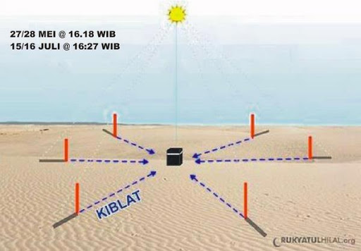 Ketika matahari melintas tepat di atas Ka’bah, umat Islam dapat mengamati bayangan dari matahari dengan masa toleransi kira-kira dua menit. Di Indonesia, karena terjadi pada sore hari maka arah bayangan menuju ke timur. Arah kiblat adalah garis yang ditarik dari ujung bayangan ke pangkal benda (ke arah barat sedikit serong ke utara).