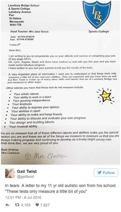 Dalam surat tersebut, Ruth terlebih dahulu memuji keberhasilan Ben menyelesaikan serangkain ujian tersebut. Ia juga memuji keberhasilan juga kemajuan yang diperoleh Ben sepanjang tahun ini. "Sebuah info teramat penting yang perlu kamu tahu adalah bahwa ujian-ujian ini hanya mengukur sebagian kecil dirimu dan kemampuanmu," tulis Ruth.