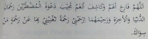 "Allahumma faarijal hammi wa kaasyifal ghammi mujiba da'watal mudhtariina rahmaanad dun-yaa wal aakhirati wa rahiimahumaa irhamnii rahmatan tughniinii bihaa 'an rahmati man siwaak."