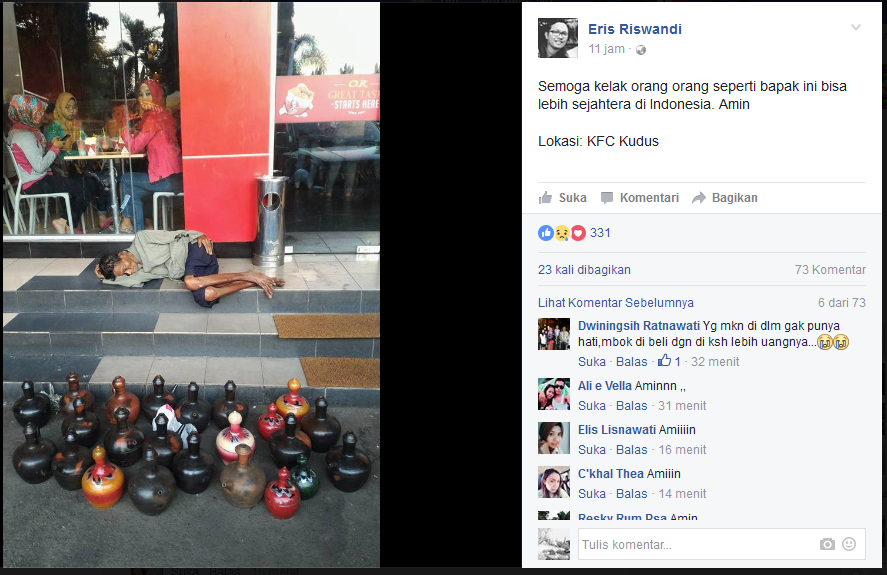 Kemudian di timpali oleh Eris Riswandi : " Kok tega mas? Mereka mungkin udah bantu, atau si mbah yg jualan gak menerima bantuan. Ini kan cerminan seorang kakek yg berjualan, klw ada rezeki di beli barang nya, tidak perlu menyalahkan yg ada di dlm kfc."