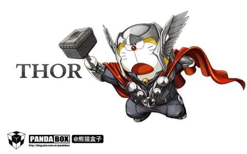 Masih dalam kelompok Avenger, Thor. Doraemon ternyata semakin melegenda dan terlahir kembali dari Dunia Dewa sehingga mampu menjadi Thor, Dewa Petir. Bisa kamu bayangkan, betapa "sakti"nya kantong ajaib yang ia miliki, ditambah dengan Palu yang bisa menghantam setiap kejahatan di seluruh dunia. Pasti keren banget bukan....