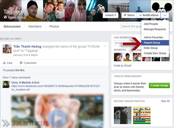 1. Buka Facebook.com. Masuk ke Grup yang mencurigakan lalu pilih Report Grup.