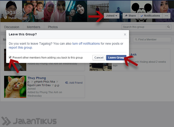 4. Sekarang kamu keluar grup. Jangan lupa untuk centang "Prevent other members from adding you back to this group" agar kamu tidak bisa diundang masuk lagi.