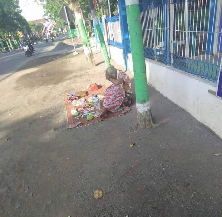 Mungkin masih banyak hal ini, namun kali ini sungguh sangat menyayat hati, apalagi jika kita melihatnya secara langsung. Seorang nenek sendirian di pinggir jalan, menggelar kain 'sewek' (kain bawahan kebaya biasanya batik), ia menjajakan barang daganganya, terlihat seperti bedak kantongan, ada sabun mandi, ada 3 buah sayur, 1 buah pasta dan sikat gigi serta beberapa mie instan, dll.