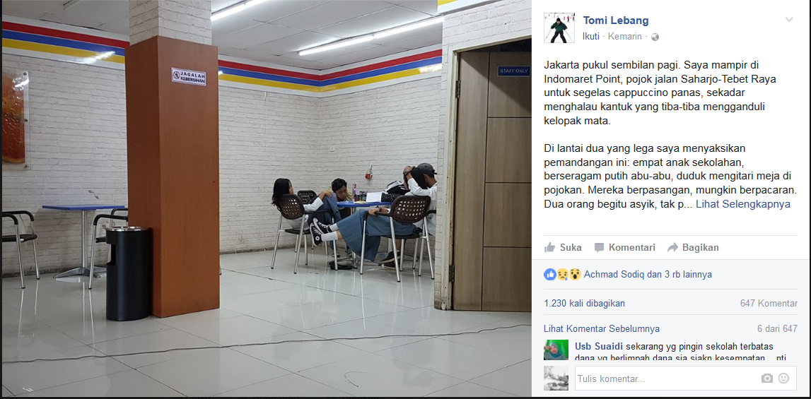 Orangtua mana yang tak akan geram saat tahu anaknya bolos sekolah. Apalagi dengan alasan yang sangat tidak masuk akal. Dan itulah yang terjadi pada 4 siswa dan siswi di Jakarta ini. Terlihat photo yang diunggah dari akun facebook Tomi Lebang, Sabtu 12 Agustus 2016, pukul 10.08 WIB.