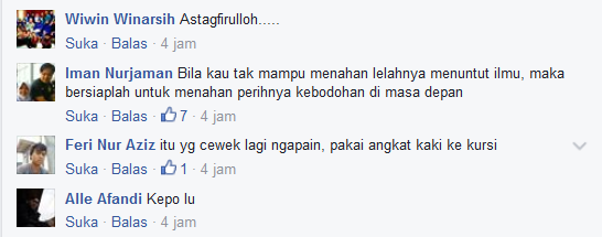 Kata akun Andrea Panca Tu : "entar..waktu di tegur ama guru karrna kedisplinan...marah..terus maki..terus panggil ortu terus dan terus.......lebih keren zaman dulu..batat batat tpi ama ortu n guru semua pada hormat n gak berani...maka dari itu kebanyakan anak muda@ pada sukses semua.."