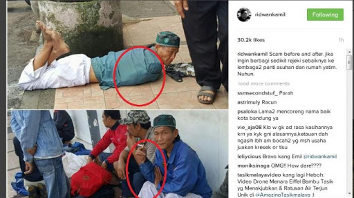 Sebelumnya Ridwan Kamil telah posting video pria yang terbukti menipu dengan pura-pura bertangan buntung.Satpol PP menyuruh pria yang tiarap di tanah dengan tangan dimasukkan ke dalam kemeja sehingga dikira bertangan buntung segera membuka baju.