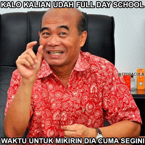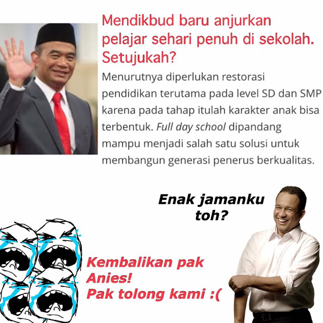 Karena hal itu netizen ramai-ramai membuat meme kocak dalam rangka menyindir kebijakan 'Full Day School' sekaligus menteri baru yang menggagasnya.