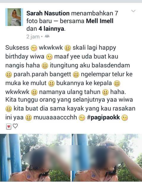 Kali ini ada seorang siswi, yang masih belum diketahui asal sekolanya, melalui akun facebook Sarah Nasution, mengupload gambar temanya yang sedang diikat dan disiram itu, dalam postingnya ia menyebutkan nama temanya itu dengan panggilan 'wiwa', ia pun dengan bangga karena telah melempar dia dengan telur tepat ke mulutnya.