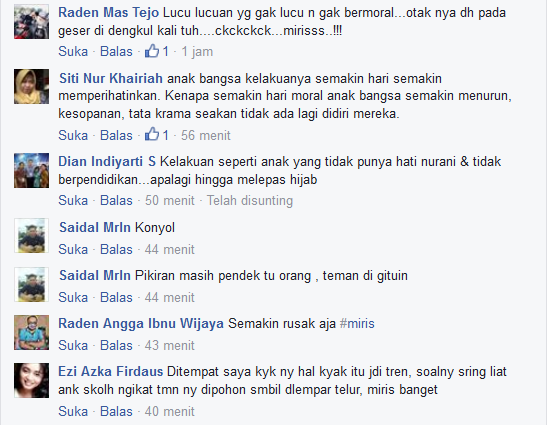 Akun Siti Nur Khairiah geram : "anak bangsa kelakuanya semakin hari semakin memperihatinkan. Kenapa semakin hari moral anak bangsa semakin menurun, kesopanan, tata krama seakan tidak ada lagi didiri mereka."Kata akun Dian Indiyarti S : "Kelakuan seperti anak yang tidak punya hati nurani & tidak berpendidikan...apalagi hingga melepas hijab"Namun akun Ezi Azka Firdaus mengungkapkan hal ini biasa saja :"Ditempat saya kyk ny hal kyak itu jdi tren, soalny sring liat ank skolh ngikat tmn ny dipohon smbil dlempar telur, miris banget"
