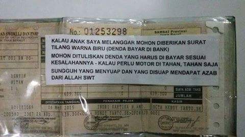 Kalau anak saya melanggar mohon diberikan surat tilang warna biru (denda bayar di bank). Mohon tuliskan denda yang harus di bayar sesuai kesalahannya. Kalau perlu motor di tahan, tahan saja. Sungguh yang menyuap dan yang disuap mendapat azab dari Allah SWT.