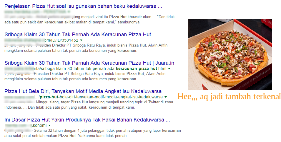 Penulis Dzikir Pikir | Ditayangkan 05 Sep 2016 Saat ini gencar pemberitaan isu bahwa Pizza Hut menggunakan bahan kadaluarsa. Lihat gambar dibawah ini, salah satu search engine raksasa terjejali info isu tentang Pizza Hut
