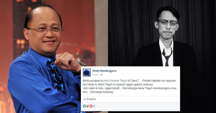 "Berita ponakanku Ario Kiswinar Teguh di Trans7.... Prihatin ngeliatin bin ngrasain kok kakak ku Mario Teguh ini ngueyel nggak ngakuin anaknya