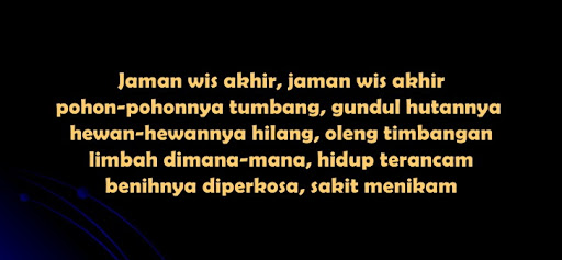 "Zaman edan, seng gak edan gak keduman" (Zaman edan, yang tidak ikut edan bakal tidak kebagian jatah). Kata-kata yang menyesatkan. Pesan untuk kita semua. Setelah membaca ini, mari kita berusaha untuk lebih baik lagi, dan menularkan kebaikan kita kepada lingkungan sekitar kita.