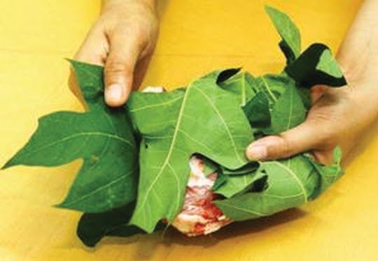 Jika tidak ada daun pepaya, Anda juga bisa memanfaatkan daun jambu atau daun jati untuk membungkus daging kambing.