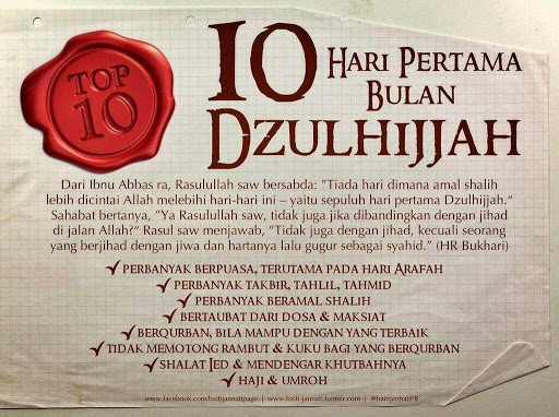 “Tidak ada hari dimana suatu amal salih lebih dicintai Allah melebihi amal salih yang dilakukan di sepuluh hari ini (sepuluh hari pertama Dzulhijjah, pen.).” Para sahabat bertanya, “Wahai Rasulullah, termasuk lebih utama dari jihad fi sabilillah? Nabi shallallahu ‘alaihi wa sallam menjawab, “Termasuk lebih utama dibanding jihad fi sabilillah. Kecuali orang yang keluar dengan jiwa dan hartanya (ke medan jihad), dan tidak ada satupun yang kembali (mati dan hartanya diambil musuh, pen.).” (HR. Ahmad, Bukhari, dan Turmudzi).