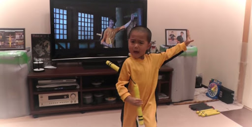 Bocah berusia lima tahun itu tidak hanya meniru Bruce Lee dari segi pakaian, seperti menggunakan seragam olahraga warna kuning dengan garis hitam. Bahkan dia mampu menirukan gaya aktor Hollywood itu dalam memainkan double stick.