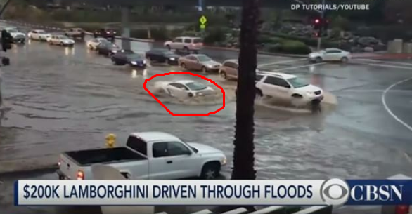 Dalam rekamannya, mobil Lamborghini Gallardo terlihat bergerak melawan arus banjir di sebuah perempatan San Diego, Amerika Serikat. Kebanyakan mobil mungkin akan berakhir dengan matinya mesin mobil, tapi hal itu tidak terjadi pada mobil Lamborghini itu.