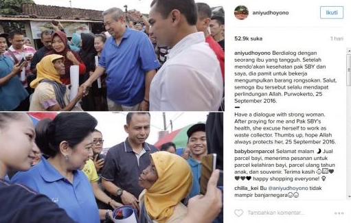 Penulis Unknown | Ditayangkan 28 Sep 2016 Mantan Ibu Negara, Ani Yudhoyono mengunggah foto di Instagram di akun miliknya. Baru diunggah beberapa hari lalu, foto itu menuai banyak respons dari netizen yang berisi pujian. Dalam foto yang diuploadnya itu, tampak mantan presiden RI ke-6, SBY menjabat tangan dengan ramah kepada seorang poemulung.