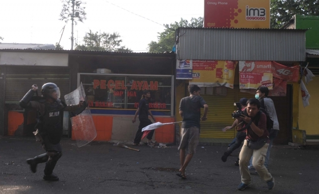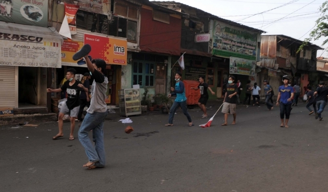 Warga Rawajati bentrok dengan petugas Satpol PP saat menolak pembongkaran puluhan rumah di bantaran rel kereta api Rawajati, Jakarta, Kamis (1/9).