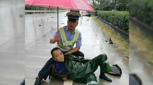 Sebuah foto yang telah beredar di lini masa memperlihatkan petugas polisi bernama Wang Yincheng tengah berada di sebuah jalan dengan kondisi hujan deras bersama seorang pria yang menjadi korban kecelakaan mobil.