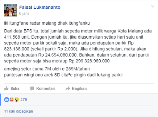 Seperti judulnya postingan Faisal Lukmananto itu mengutip dari Radar Malang, menjelaskan betapa besarnya penghasilan tukang parkir seluruh Kota Malang, hingga mencapai Rp 296.328.960.000,-