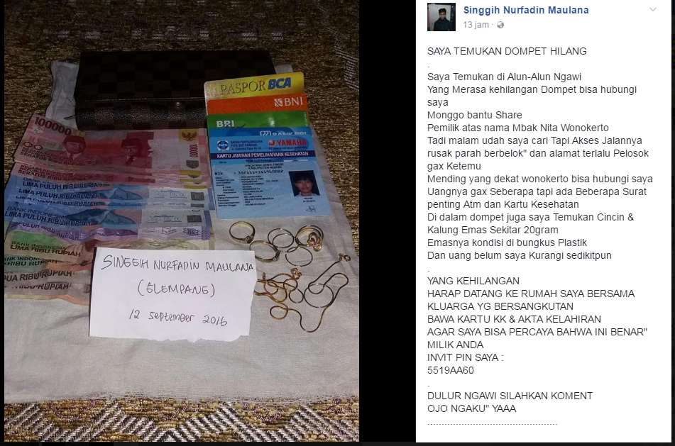 Pemuda yang mempunyai akun facebook Singgih Nurfadin Maulana ini, memposting temuanya yang isinya lumayan banyak, bayangkan saja ada emas kisaran 20 gram dan uang ratusan ribu. Namun itu tak membuat pemuda ini, lupa. Ia berusaha mencari alamat orang yang berada di identitas yang berada dalam dompet itu. Namun karena terlalu pelosok dan jalanya pun tidak mudah. Pemuda yang diketahui tinggal di Ngawi Jawa Timur, ini mengambil inisiatif untuk mengumumkan di akun facebook miliknya.