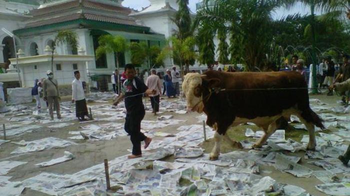 Dua sapi ukuran besar di Masjid Agung Palembang, berasal dari Presiden RI Jokowi dan Gubernur Sumsel Alex Noerdin, Senin (12/11/2016).