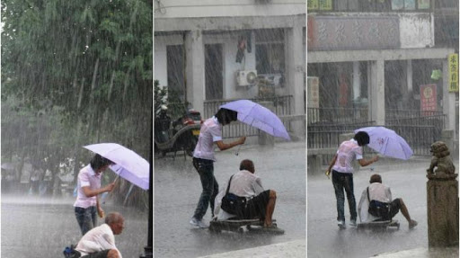 Tertangkap kamera, seorang perempuan yang melihat seorang pengemis difabel kehujanan ini langsung berlari mengambil payung kemudian melindungi pengemis yang tak bisa berjalan itu dengan payung tersebut.