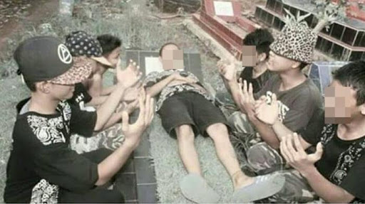 Pada foto ini memperlihatkan kelakuan sejumlah anak muda yang berada di sekitar makam atau kuburan.