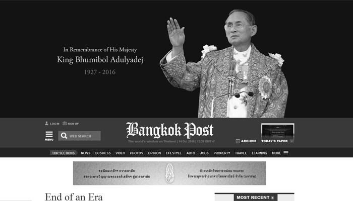 Hal yang sama juga diterapkan untuk media daring. Situs berita Bangkok Post, sebagai contohnya, kini mengubah seluruh tampilan warnanya menjadi hitam-putih. Begitu pula dengan media The Nation Thailand.