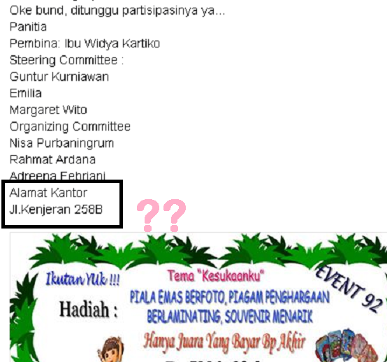 Alamat hanya ditulis di "Jl. Kenjeran 258B". Di kota mana? Mengapa alamat yang ditulis tidak mendetail ditulis. Kota Surabaya ? Jakarta? Tidak jelas disebut kota mana penyelenggaranya. Ini patut dicurigai sebagai modus penipuan. Bila ditulis alamat dengan jelas pun, biasanya penipu memberikan alamat palsu.