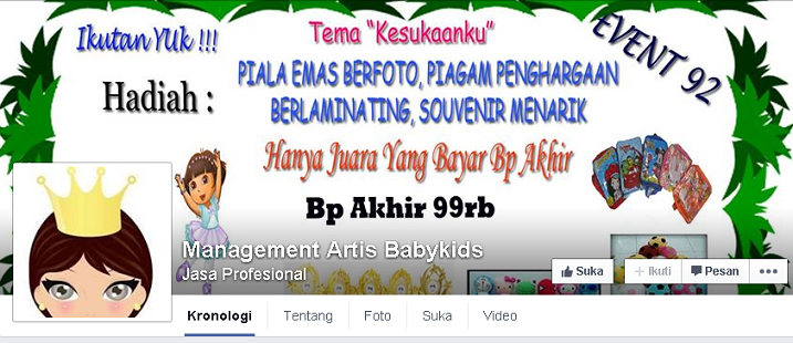 Dikutip dari Kompasiana oleh Agung Soni, inilah rupanya yang dijadikan sasaran empuk oleh empunya "Page" bernama "Management Artis Babykids". Setiap bulan mereka mengadakan even lomba dengan menjaring banyak minat orang tua di FB. Dengan nama "management artis" banyak ortu yang berharap anak mereka bisa menjadi orang terkenal atau artis cilik. Tak sedikit dari para peserta rela mengorbankan anak-anaknya dihiasi, didandani bak orang dewasa agar terlihat lebih cantik, lebih gagah seperti dambaan mereka.