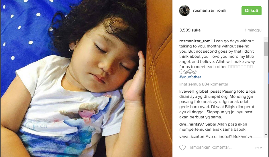 Ungkapan kerinduan Enji kepada Bilqis, yang diungkapkan di akun instagram istrinya, Rosmanizar alias Niza.