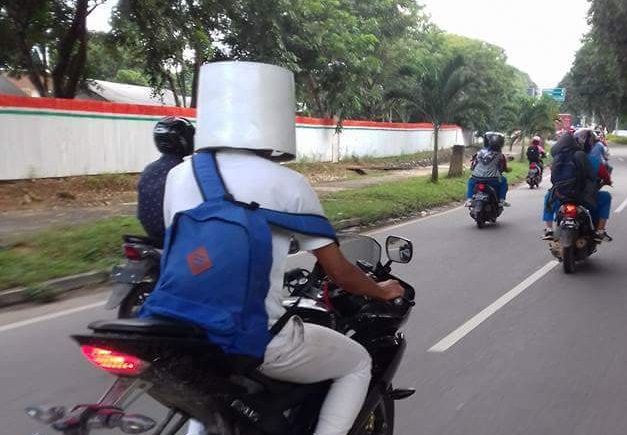 Sebab bukannya memakai helm, pria ini justru memakai benda semacam ember sebagai penutup kepala.
