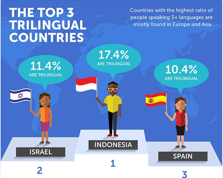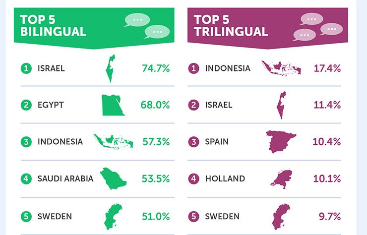Lima besar negara bilingual adalah Israel (74,7 persen), Mesir (68,0 persen), Indonesia (57,3 persen), Arab Saudi (53,5 persen) dan Swedia (51,0 persen). Sementara untuk lima besar trilingual, setelah Indonesia, Israel dan Spanyol, ada Belanda (10,1 persen) serta Swedia (9,7 persen).