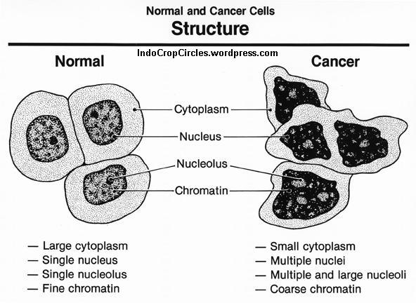 Perbedaan struktur antara sel normal (kiri) dan sel kanker (kanan). Sel kanker berasal dari sel normal yang bermutasi lalu rusak dan akan berkembang, kemudian menyebar.