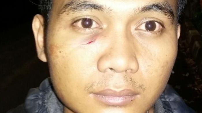 Ketika ia berhenti, oknum tersebut langsung memukul Ipul di wajah bagian bawah.
